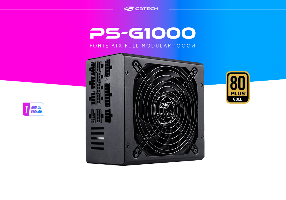A Fonte ATX 1000W PS-G1000 80+ Gold foi projetada para oferecer alto desempenho e flexibilidade. Com potência de 1000W e certificação 80PLUS Gold, ela garante eficiência energética superior, com menor desperdício de energia e mais economia. O design Full Modular permite a personalização completa do cabeamento, otimizando a organização e o fluxo de ar no gabinete. Seus cabos flat pretos são ideais para manter um visual limpo e organizado. Equipada com PFC Ativo DC-DC, essa fonte oferece estabilidade e performance aprimorada e para segurança adicional, a fonte conta com proteções contra curto-circuito, sobretensão e sobrepotência, garantindo a proteção do sistema em situações críticas.